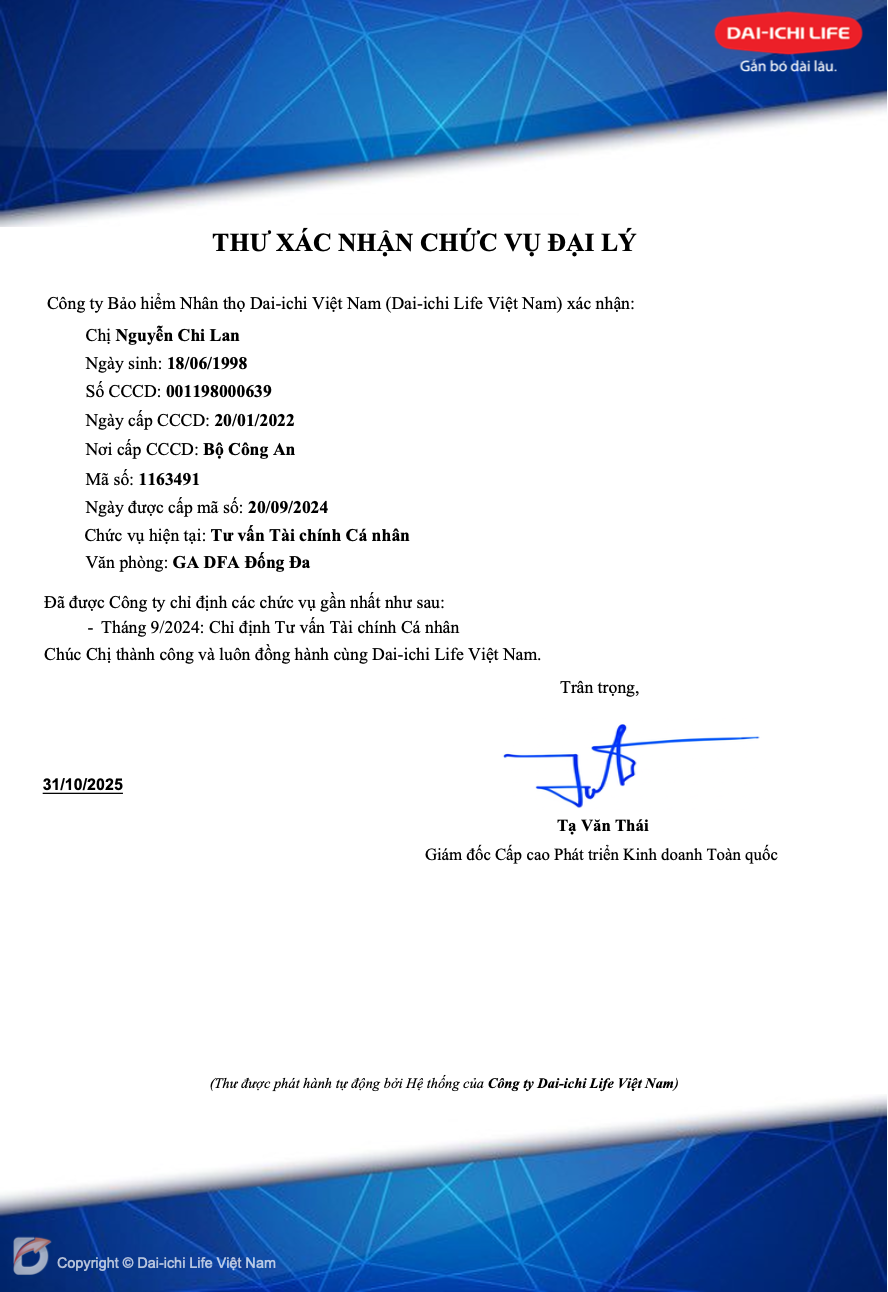 Tôi là một nhân viên tư vấn bảo hiểm với hơn 4 năm kinh nghiệm làm việc tại Dai-ichi Life Việt Nam. Trong suốt thời gian công tác, tôi đã tích lũy được nhiều kinh nghiệm trong cả mảng bảo hiểm nhân thọ và phi nhân thọ, bao gồm các sản phẩm như bảo hiểm xe máy, ô tô, và bảo hiểm thai sản. Tôi luôn đặt khách hàng làm trung tâm, lắng nghe nhu cầu và đưa ra giải pháp phù hợp, giúp khách hàng an tâm tài chính trước mọi rủi ro. Với tinh thần trách nhiệm, nhiệt huyết và chuyên môn vững vàng, tôi mong muốn tiếp tục phát triển sự nghiệp trong lĩnh vực bảo hiểm....